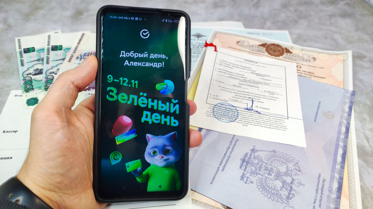 На фотографии изображён смартфон в руке, на экране которого отображено приветствие в банковском приложении с текстом «Добрый день, Александр!» и рекламой события «Зелёный день». На фоне лежат официальные документы — нотариально заверенный лист с апостилем, свидетельство о государственной регистрации права, аттестат и несколько российских банкнот номиналом 500 и 1000 рублей. Снимок иллюстрирует сочетание финансовых технологий и юридических процедур. Его можно использовать в материалах о цифровых услугах, оплате госпошлин и апостилировании документов.