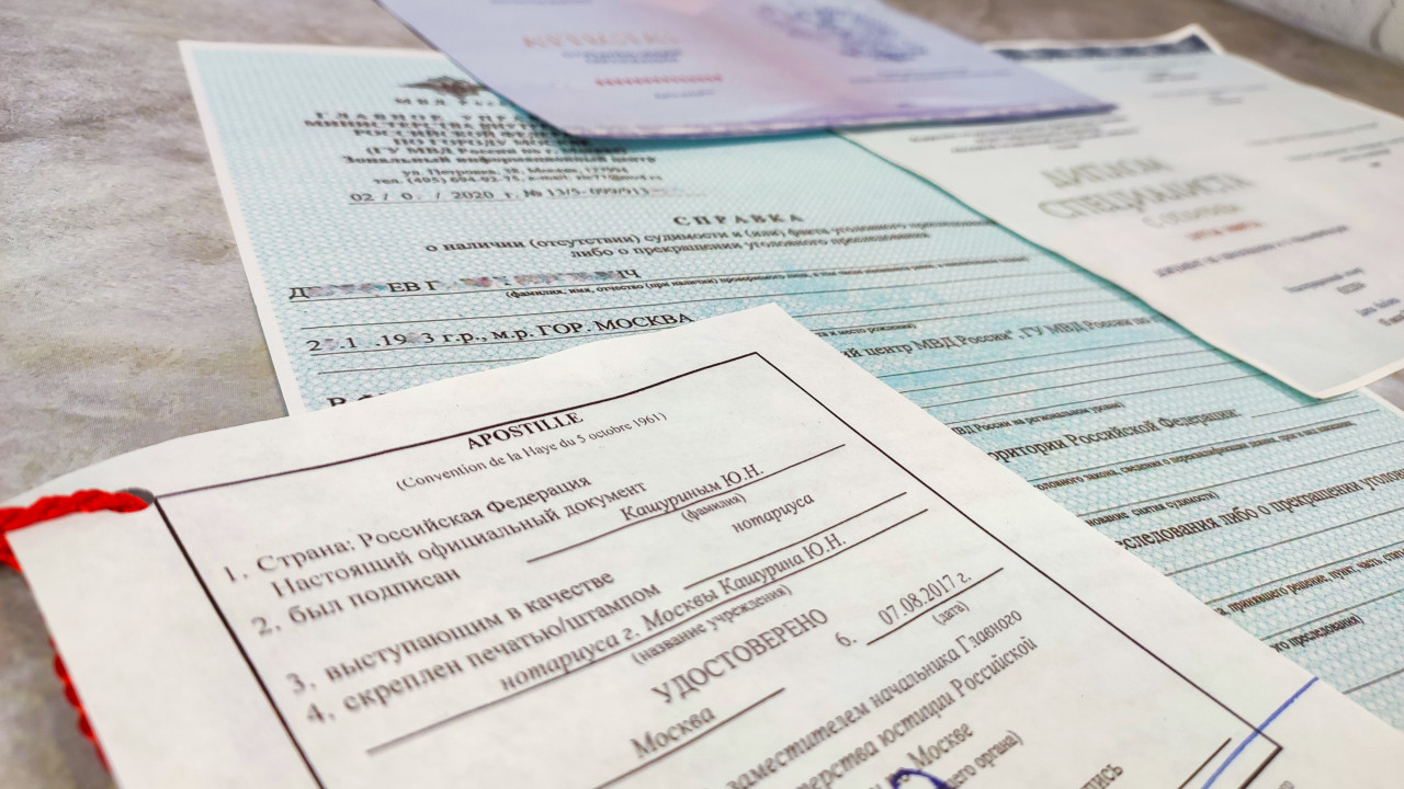На фотографии изображены официальные документы — лист с апостилем, заверенным Министерством юстиции Российской Федерации, и справка о наличии (отсутствии) судимости, выданная МВД России. На заднем плане также видны аттестат и диплом специалиста. Апостиль прошит красной нитью и содержит подпись нотариуса, подтверждая подлинность документа. Сцена иллюстрирует процесс подготовки и легализации юридических документов для представления за рубежом. Фотография может использоваться в публикациях о международных процедурах, апостилировании и подтверждении документов.