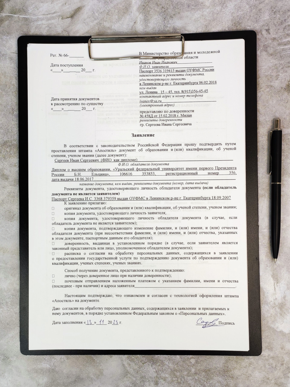 На фотографии показано заявление, оформленное на бланке с чёрной рамкой и закреплённое на планшете. Документ адресован в Министерство образования и молодёжной политики, содержит сведения о заявителе и указание на документ об образовании, подлежащий апостилированию. Внизу видна дата заполнения — 13.11.2023, и подпись. Рядом лежит чёрная ручка. Фотография иллюстрирует процесс подачи официального заявления для подтверждения подлинности образовательных документов. Подходит для публикаций о государственной легализации и делопроизводстве.
