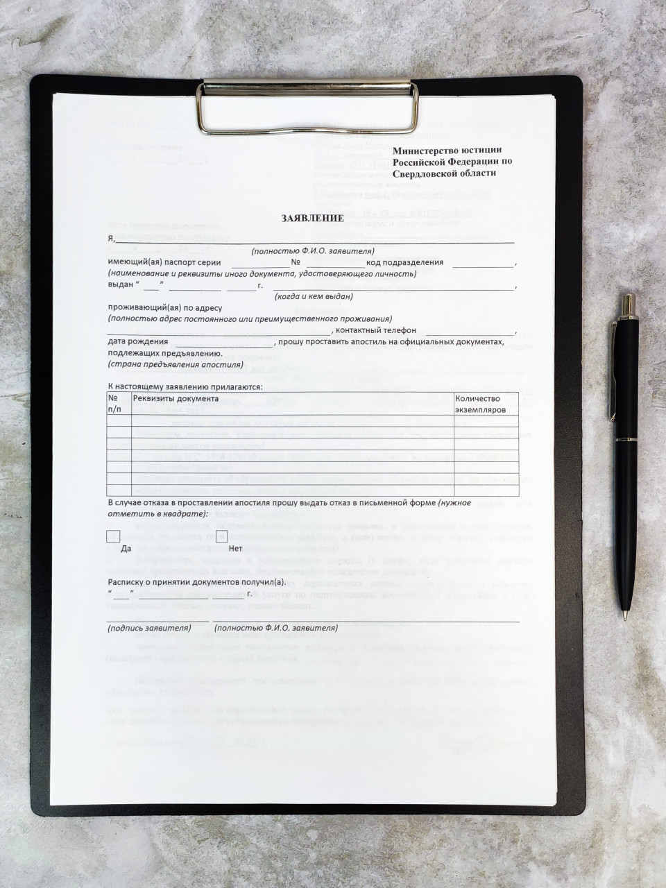 На фотографии показан пустой бланк заявления, размещённый на чёрном планшете. В верхней части указано «Министерство юстиции Российской Федерации по Свердловской области». Форма предназначена для подачи заявления о проставлении апостиля на официальные документы, вывозимые за пределы России. Справа лежит ручка. Сцена отражает процесс делопроизводства и оформления государственных услуг. Фотография может использоваться в материалах о нотариальных процедурах, юридических документах и правилах легализации.