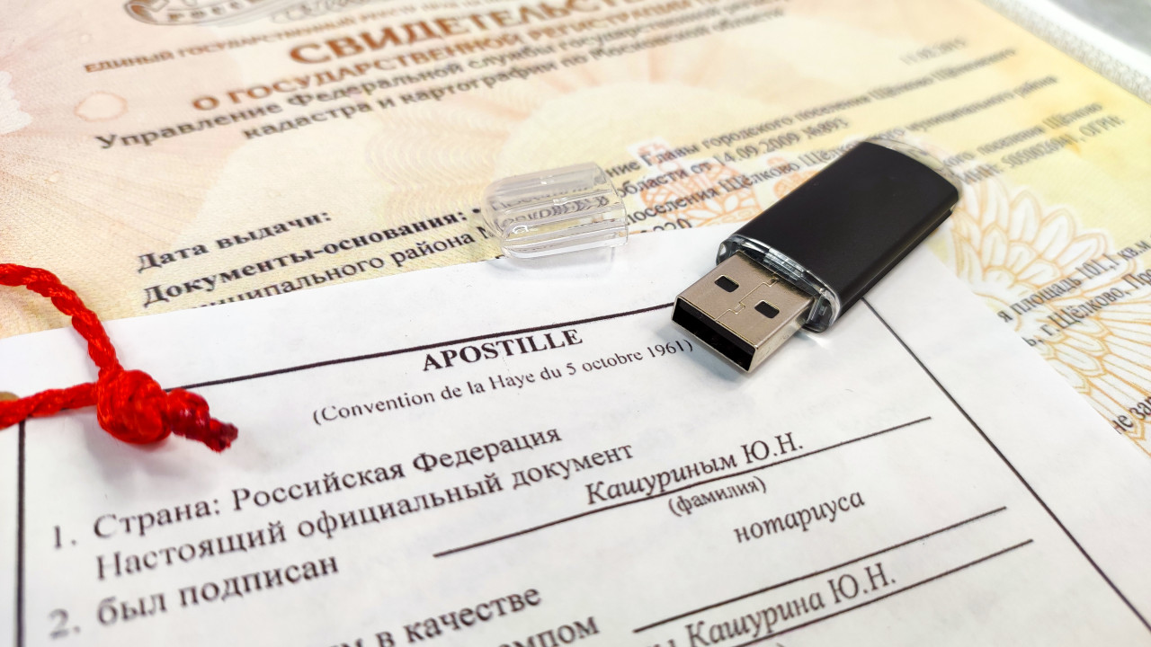 На переднем плане изображён USB-накопитель и снятая прозрачная крышка, лежащие на документе апостиля, прикреплённого к свидетельству о государственной регистрации права. На документе видны печати, подписи и элементы защиты. Фотография иллюстрирует сочетание бумажных и электронных способов хранения юридически значимой информации. Такой снимок можно использовать в публикациях о нотариальных услугах, цифровизации документооборота и международной легализации бумаг.