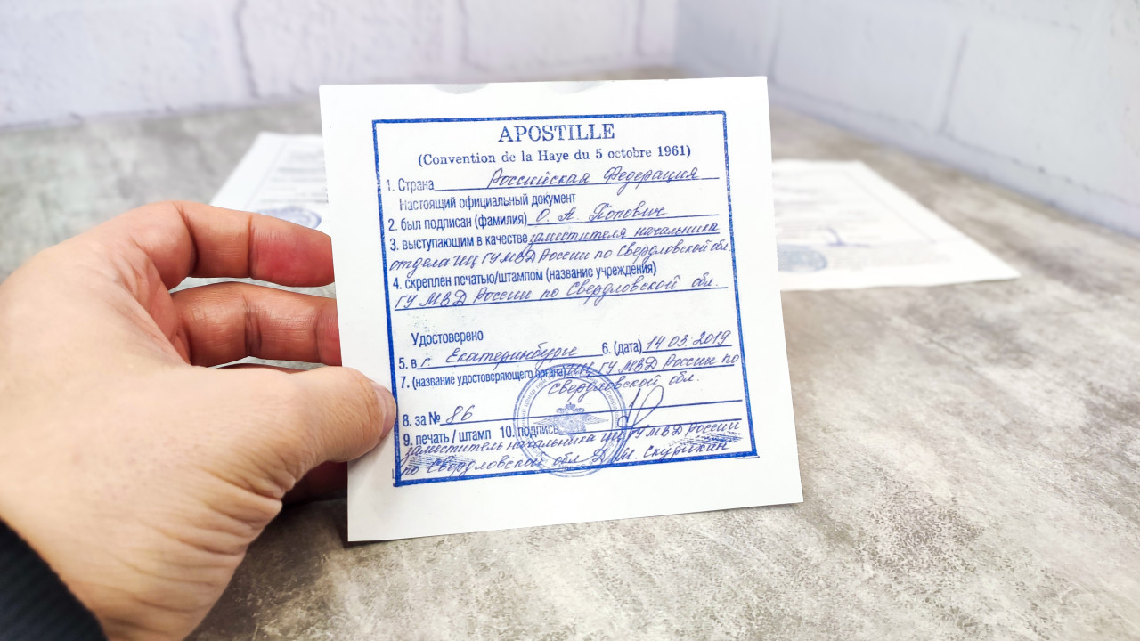 На фотографии показан апостиль, выданный Министерством внутренних дел Российской Федерации в Екатеринбурге. Документ оформлен на русском и французском языках в соответствии с Гаагской конвенцией 1961 года. На бланке синего цвета указаны сведения о стране, должностном лице, дате и месте удостоверения, а также проставлена печать и подпись. Апостиль подтверждает подлинность подписи и печати на официальных документах, предназначенных для использования за границей. Снимок сделан на сером фоне, в кадре видна рука, держащая документ. Фотографию можно использовать в материалах о легализации документов, международном праве, апостилировании и нотариальных действиях.