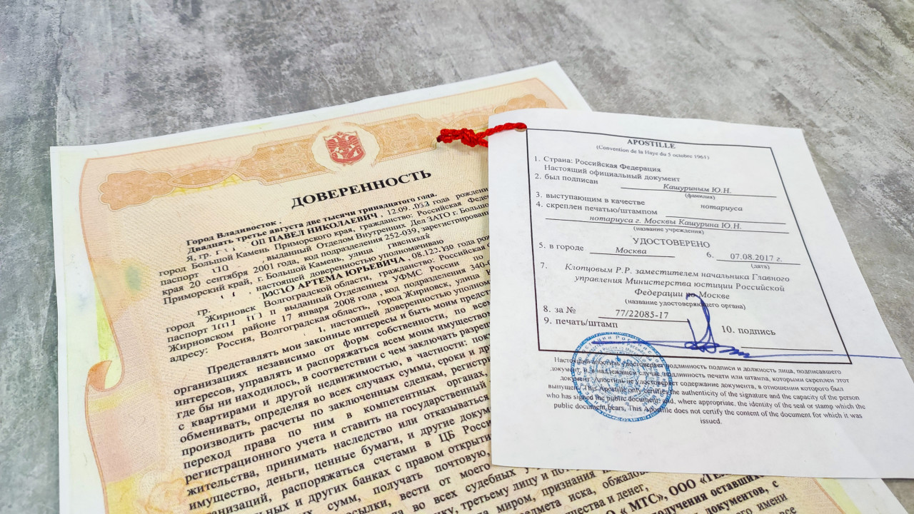 На фото изображена нотариальная доверенность, дополненная листом апостиля, скрепленным красной нитью. Апостиль выдан Министерством юстиции Российской Федерации в Москве и оформлен на русском и французском языках. Основной документ содержит герб Российской Федерации и текст доверенности, оформленной в соответствии с нотариальными правилами. Снимок сделан на сером фоне, текст частично читаем. Фотография иллюстрирует процесс легализации доверенностей для международного использования. Подходит для публикаций о нотариальных услугах, апостилировании, подготовке документов для загранпоездок и юридических процедур.