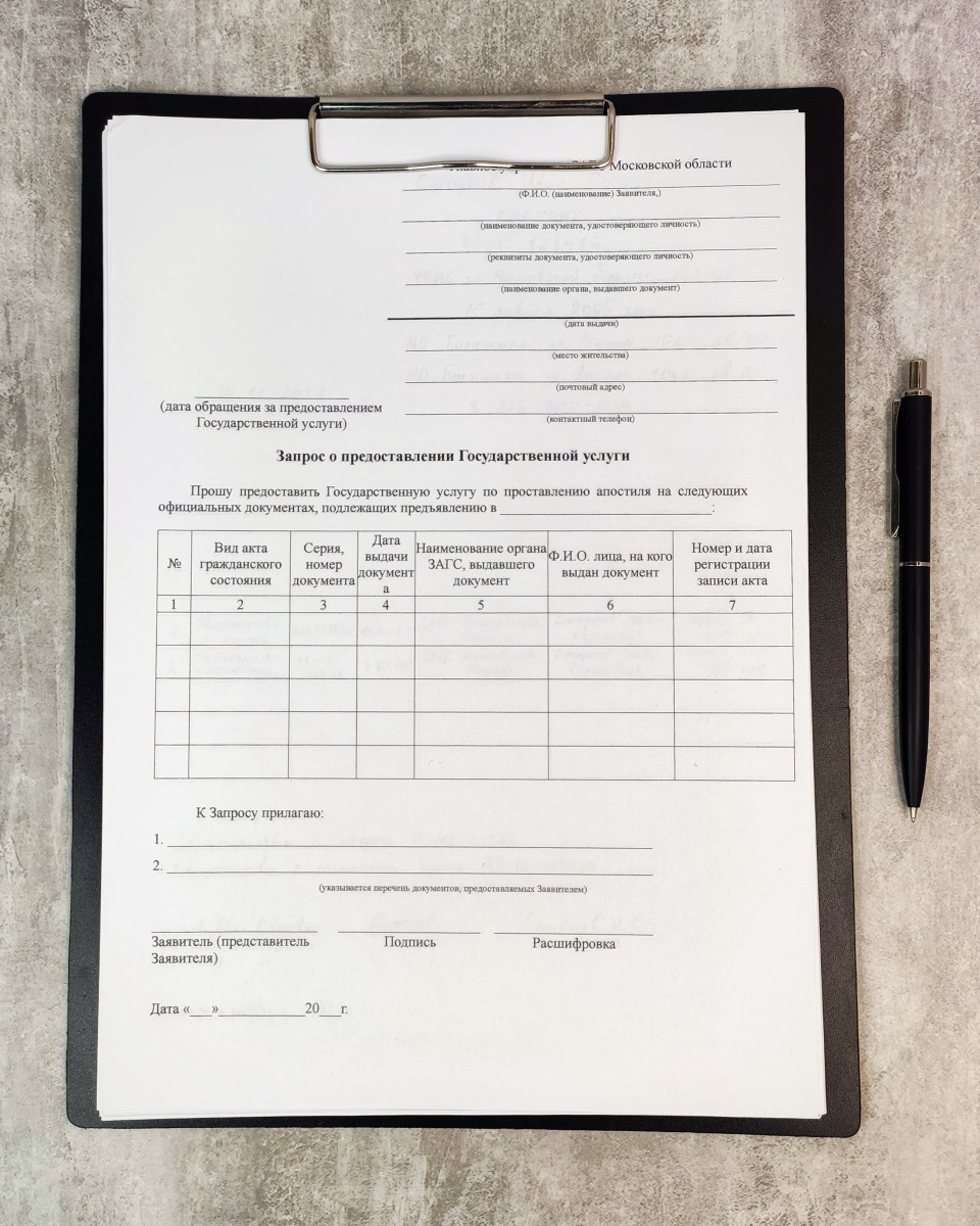 На изображении представлен пустой бланк запроса на предоставление государственной услуги по проставлению апостиля. Форма закреплена на черном планшете, рядом расположена ручка. Документ не заполнен, поля предназначены для внесения данных заявителя, органа ЗАГС и перечня документов. Съемка выполнена на сером фоне. Фотография используется в обучающих материалах о подготовке юридических бумаг, примерах официальных форм и инструкциях по получению апостиля.