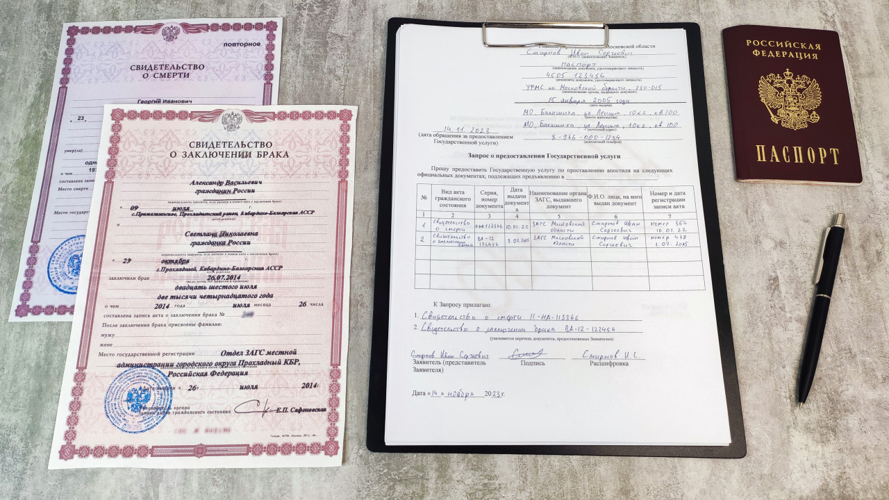 На фото изображены российский паспорт, свидетельства о браке и смерти, а также заполненный бланк запроса на проставление апостиля, закрепленный на планшете. Все документы разложены на сером столе, рядом находится ручка. Композиция отражает процесс подачи документов для легализации актов гражданского состояния. Изображение подходит для иллюстраций к юридическим статьям о нотариальных услугах, госрегистрации, получении апостиля и международной правовой практике.