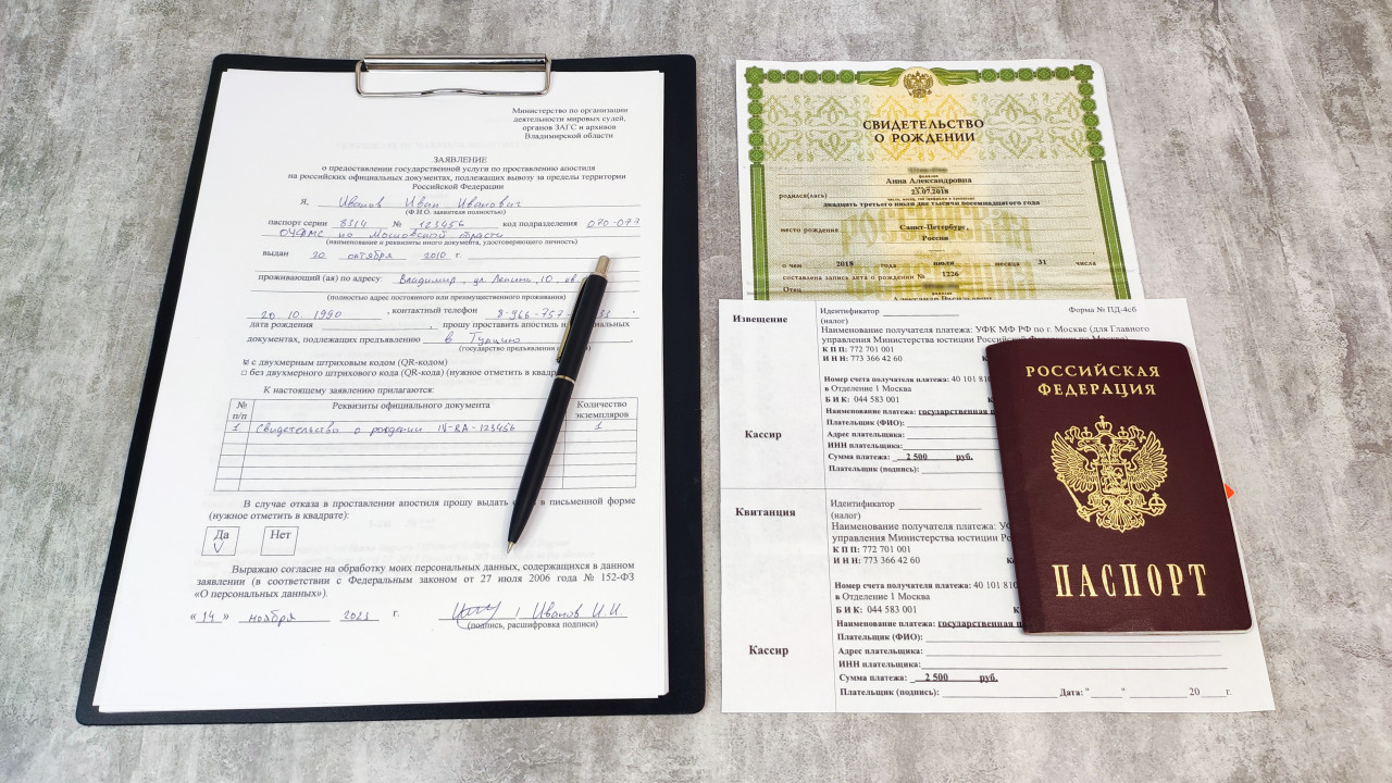 На фотографии изображён комплект документов, подготавливаемых для подачи заявления на проставление апостиля на российские официальные документы. На сером фоне стола лежит бланк заявления, закреплённый на планшете с ручкой, свидетельство о рождении, квитанция об оплате госпошлины и паспорт гражданина Российской Федерации. Такие документы необходимы при подтверждении подлинности актов гражданского состояния для использования за границей. Изображение можно использовать в статьях о легализации документов, апостилировании, госуслугах и международном документообороте.