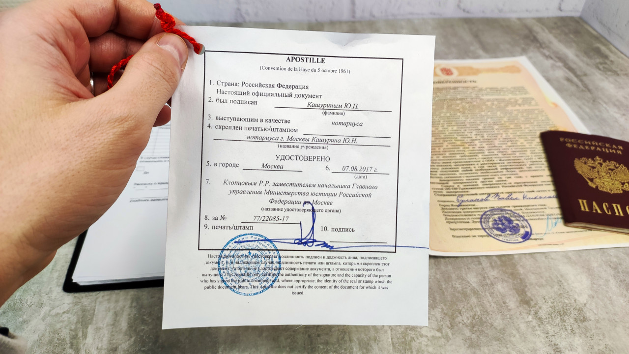 На фотографии показан документ с апостилем, удостоверяющим доверенность. Бумага прошита красной нитью и содержит подпись заместителя начальника Главного управления Министерства юстиции Российской Федерации. Документ держит человек, а на заднем плане видна доверенность и паспорт гражданина РФ. Видно, что доверенность оформлена на фирменном бланке с гербом, что подчёркивает её официальный характер. Сцена иллюстрирует процесс подтверждения подлинности нотариально заверенных документов. Фото подходит для статей о юридическом оформлении, апостилировании, легализации и нотариальных услугах.