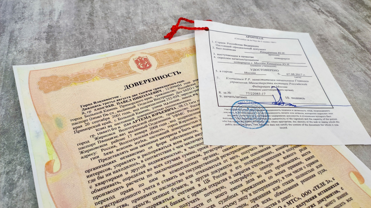 На снимке изображена нотариально заверенная доверенность, к которой приложен апостиль. Документы прошиты красной нитью, что подтверждает их подлинность. На доверенности читается герб Российской Федерации и текст с указанием города Владивостока. Апостиль содержит печать Министерства юстиции РФ и подпись должностного лица. Композиция выполнена на сером фоне, характерном для документальных съёмок. Фотография может использоваться в юридических и образовательных материалах о нотариальных процедурах, международной легализации и оформлении доверенностей для использования за границей.