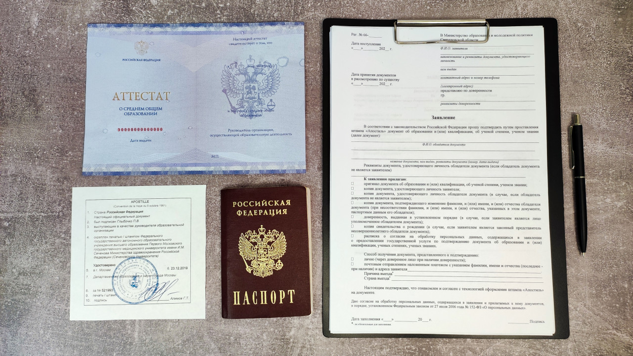 На фото представлены официальные документы: аттестат о среднем общем образовании Российской Федерации, лист с апостилем, паспорт гражданина РФ и заявление на проставление апостиля, размещённые на сером фоне. Документы аккуратно разложены, апостиль выдан Департаментом образования и науки города Москвы и содержит синюю круглую печать и подпись должностного лица. Аттестат выполнен в голубых тонах с гербом России и надписью «Аттестат о среднем общем образовании». Рядом лежит чёрная ручка. Снимок иллюстрирует процесс подтверждения подлинности образовательных документов.