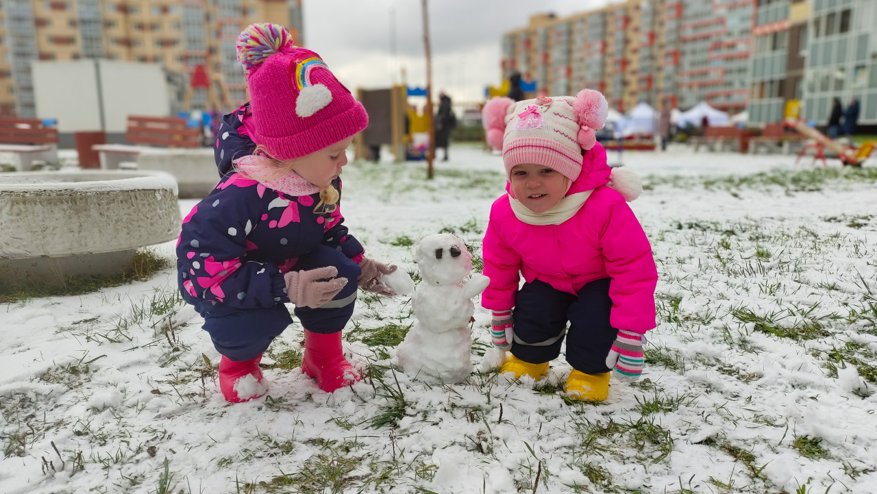 На изображении показаны двое детей на газоне, покрытом тонким слоем первого снега. Они находятся в городской среде рядом с жилыми зданиями и детской площадкой, которая видна во втором плане. Одежда и позы детей указывают на уличную игру в зимний период. Фотография может применяться в материалах о детской активности, сезонных прогулках и семейном времяпровождении.