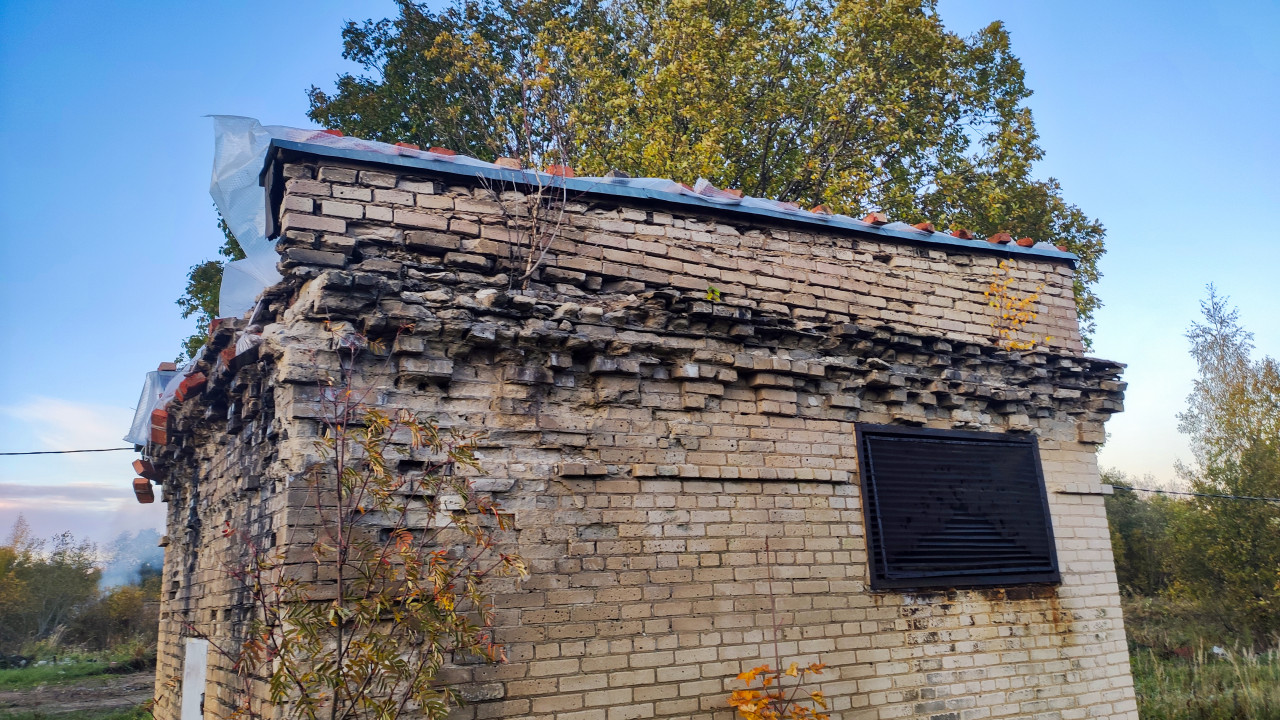 На фото изображено небольшое кирпичное строение с сильно повреждёнными стенами и утратой части кладки. Крыша укрыта плёнкой и зафиксирована кирпичами для предотвращения дальнейшего разрушения. На одной из стен установлена вентиляционная решётка. Кирпичная кладка имеет трещины, осыпания и следы выветривания, что указывает на длительное отсутствие ремонта. Вокруг здание окружено растительностью и деревьями, характерными для заброшенных территорий. Фотография подходит для использования в статьях о состоянии старых сооружений, сохранении архитектурного наследия, инженерных постройках XX века и документации аварийных объектов.