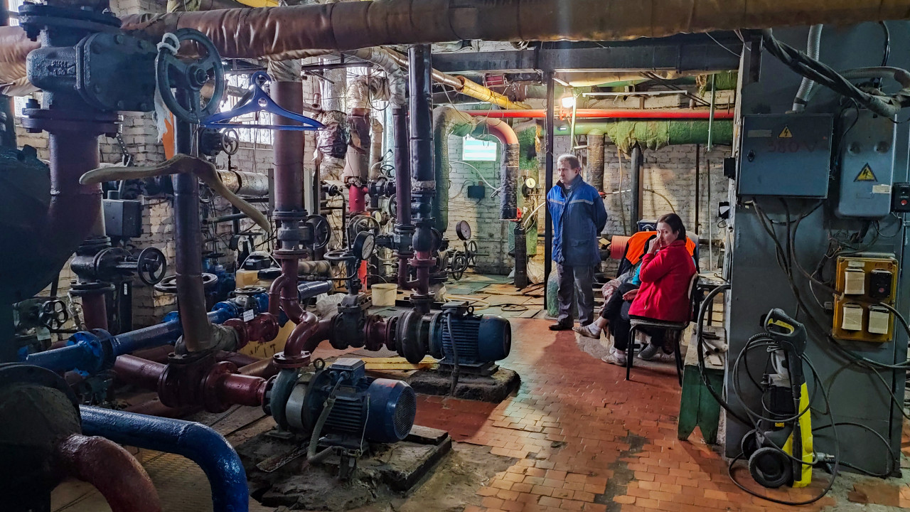 Тепловой узел жилого дома с трубопроводами и персоналом