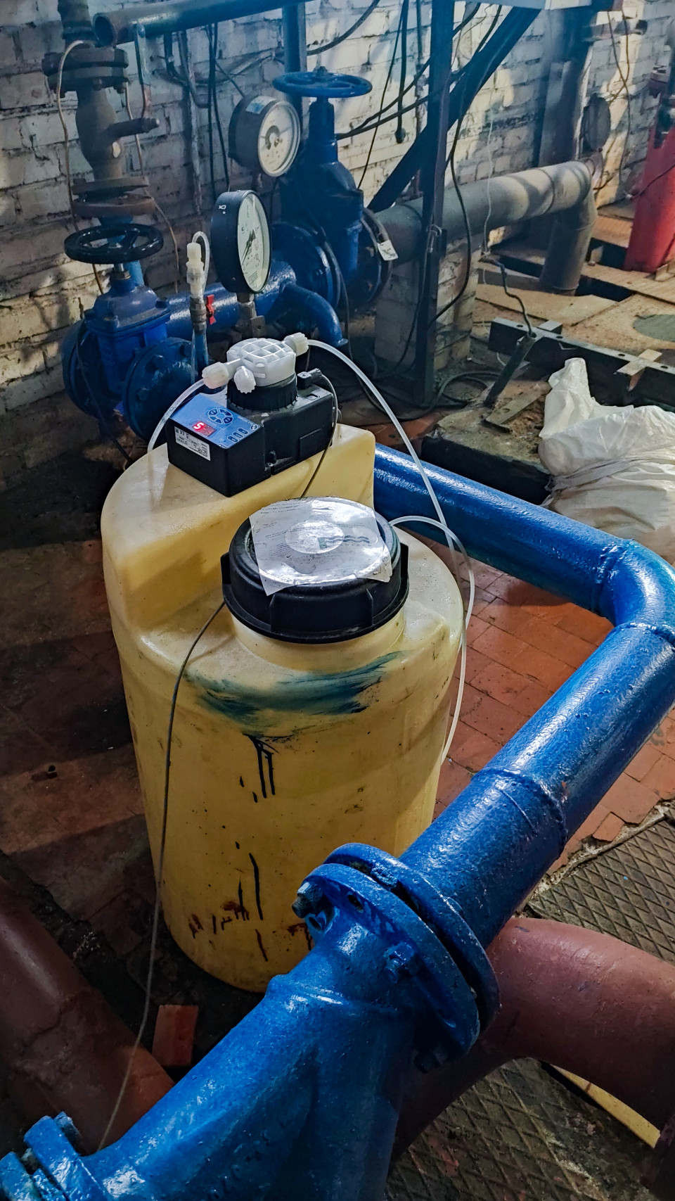На фотографии показана пластиковая жёлтая ёмкость цилиндрической формы с установленным на крышке насосным блоком и подключёнными шлангами. На заднем плане видны элементы инженерных систем — металлические трубы, манометры, задвижки и насосное оборудование, окрашенные в синий цвет. Помещение похоже на котельную или узел водоподготовки, где осуществляется дозирование реагентов или перекачка жидкости. Снимок подходит для иллюстрации технических процессов, оборудования систем водоснабжения и публикаций о промышленной автоматике.