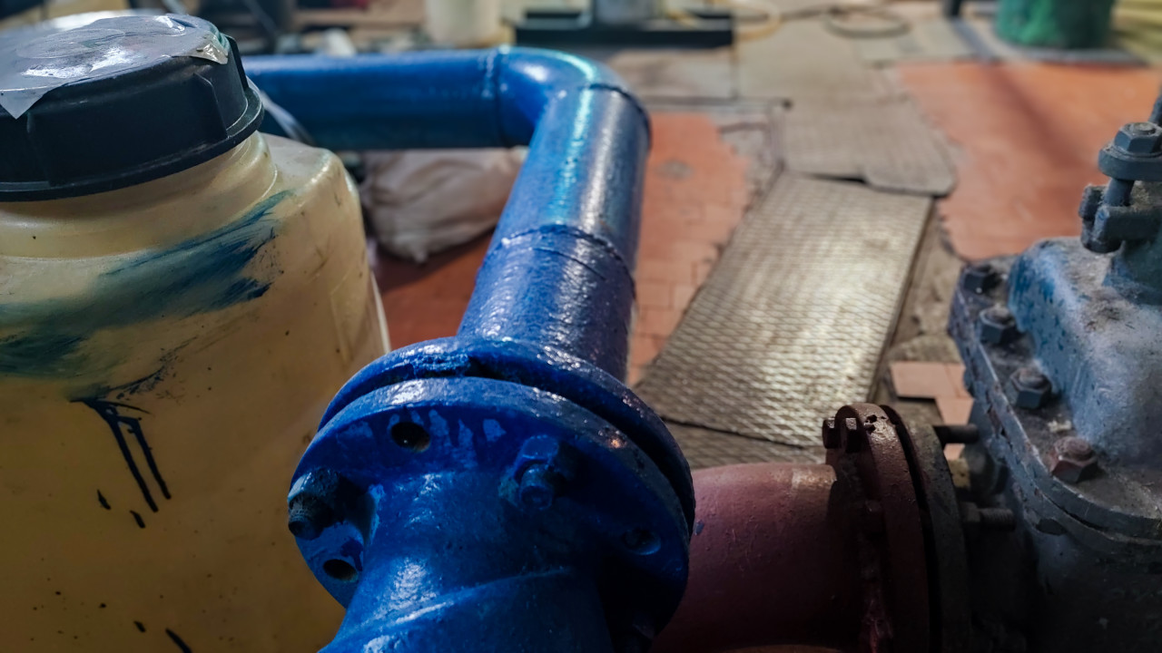 На изображении виден фрагмент синего металлического трубопровода, проложенного под углом и соединённого фланцами. Рядом находится пластиковая жёлтая ёмкость с крышкой и следами эксплуатации. Поверхность труб окрашена и местами имеет потёртости. Сцена снята в промышленном помещении с плиточным полом и металлическим настилом. Такие узлы характерны для водоподготовительных и насосных систем. Фотография подходит для иллюстрации инженерных решений, технических отчётов и обучающих материалов.