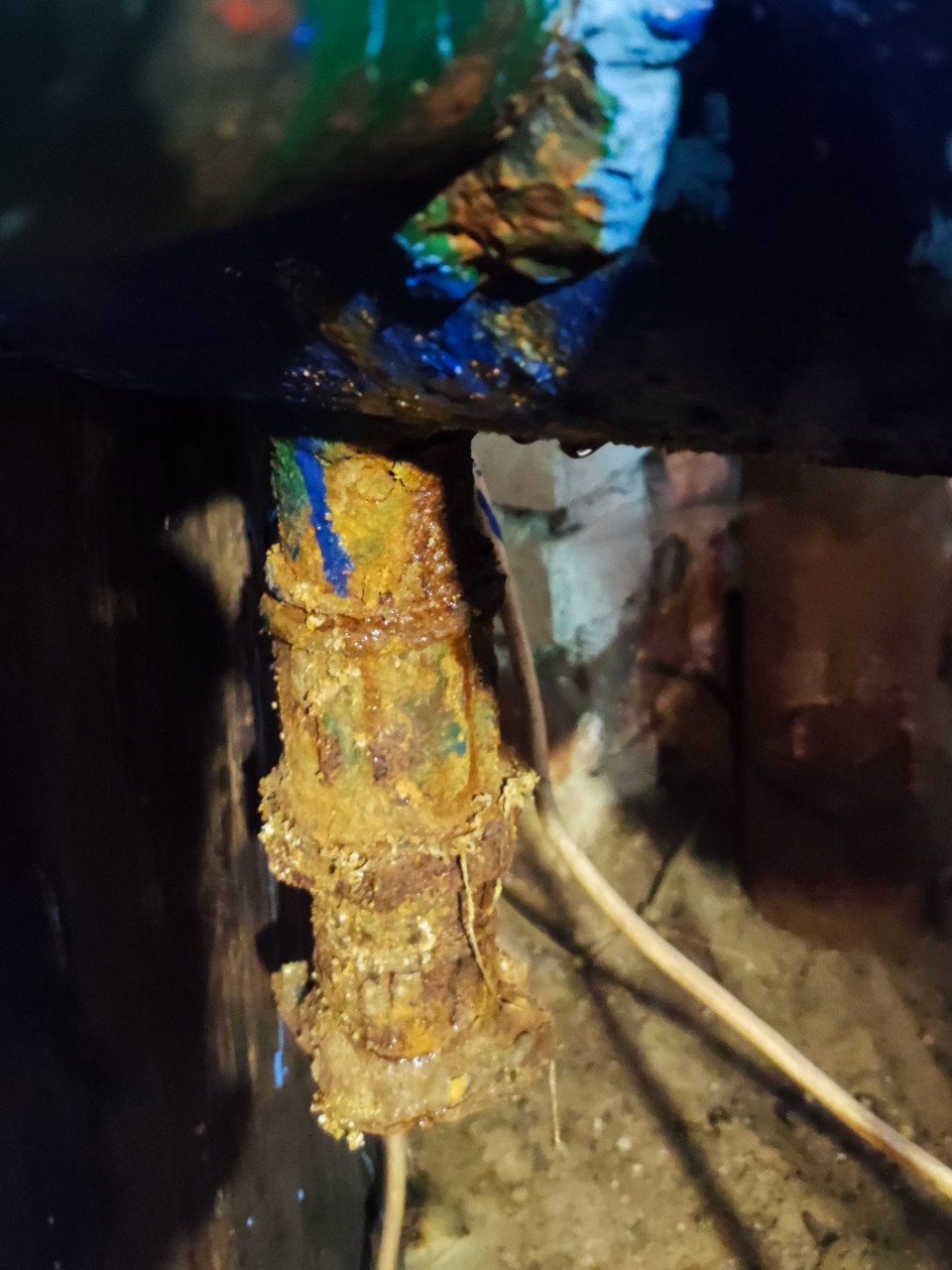 На фото крупным планом показан нижний участок металлического трубопровода с сильной коррозией. Железная труба с ржавчиной и остатками краски соединена с синей магистралью, окрашенной эмалью. Под трубой на полу заметны следы влаги и ржавые пятна, указывающие на возможную течь. Изображение демонстрирует состояние изношенных инженерных сетей и подходит для иллюстраций, связанных с техническим обслуживанием, дефектами и ремонтом систем водоснабжения.