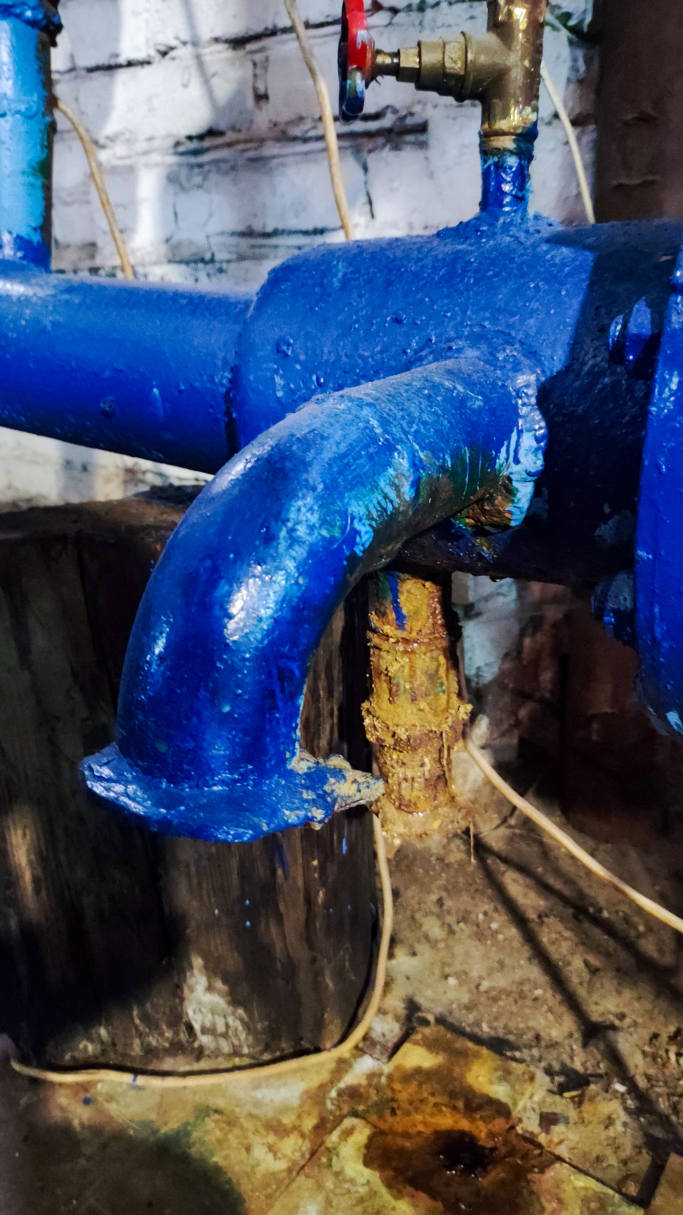 На фотографии показан фрагмент синего трубопровода с латунным вентилем и нижним отводом. Металлическая труба окрашена, но на отдельных участках заметны следы ржавчины и подтёков. Фон составляют кирпичная стена и элементы старого технического помещения. Подобные конструкции применяются в инженерных системах водоснабжения и отопления для регулирования потока воды. Фото можно использовать в материалах по техническому надзору, инженерным коммуникациям и диагностике оборудования.