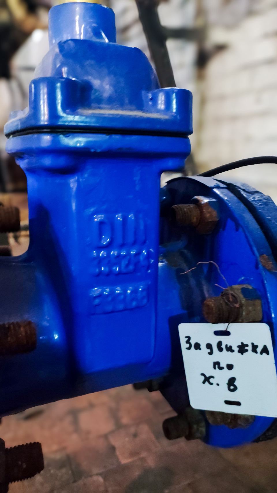 Синяя задвижка на трубопроводе с биркой