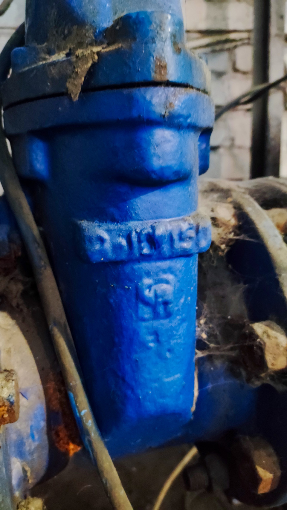 Изображена металлическая задвижка синего цвета с литой маркировкой «DN150» и «PN10» на корпусе. Оборудование соединено с фланцевым трубопроводом, видны болты и металлические детали. Такая арматура применяется в системах водоснабжения для регулирования потока жидкости. Фото снято в техническом помещении с кирпичными стенами, характерном для подвалов или тепловых пунктов. Изображение может использоваться в инженерных отчётах, паспортах оборудования и учебных материалах по эксплуатации сетей.
