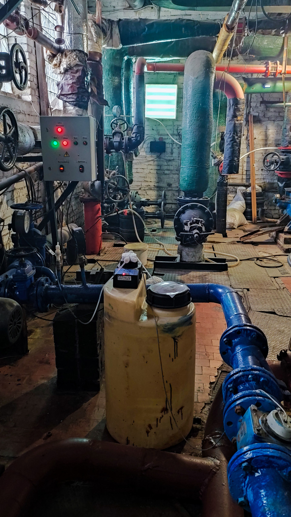 На снимке изображено помещение насосной станции или котельной с множеством трубопроводов, вентилей и инженерного оборудования. В центре кадра виден участок синего трубопровода с установленным водомером и пластиковая ёмкость жёлтого цвета, подключённая к системе. На стене расположён щит управления с индикацией работы. Обстановка указывает на промышленное или коммунальное назначение объекта. Фото можно использовать для иллюстрации технических помещений, систем водоснабжения и отопления.