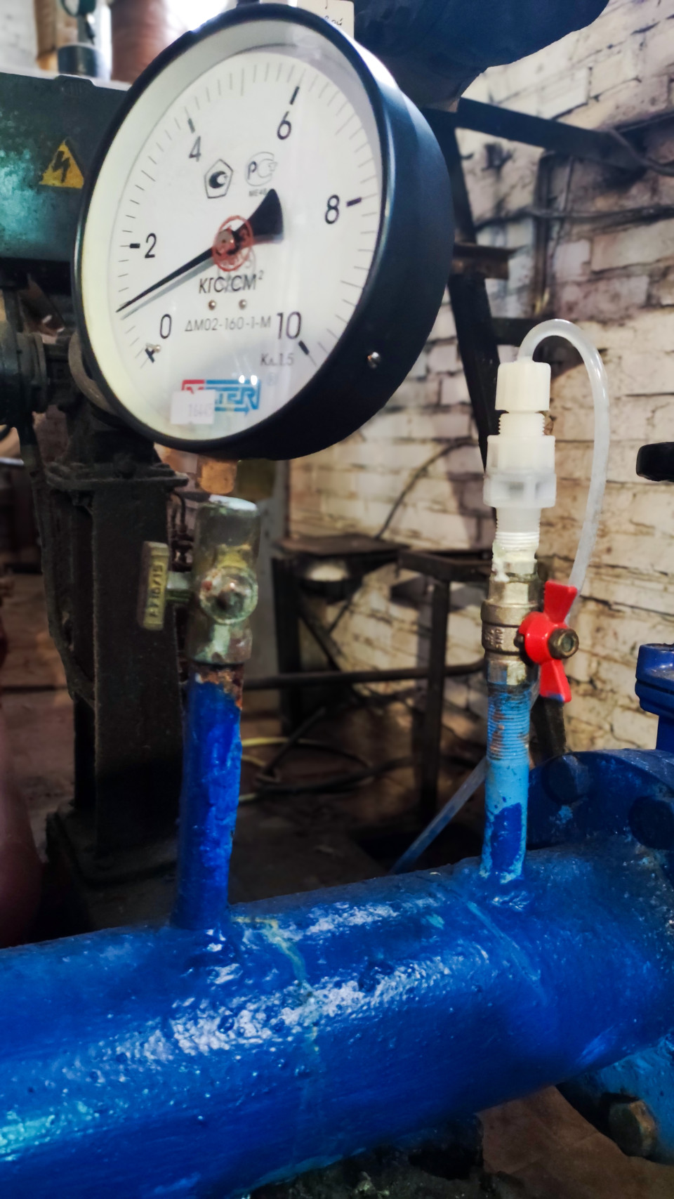 На изображении виден манометр с трубным подводом, установленный на металлическом трубопроводе. Рядом проходит гибкий шланг с пластиковым краном и соединением, вероятно предназначенным для подачи реагента или отбора давления. Поверхность трубы окрашена в синий цвет, вокруг видны детали старого оборудования и кирпичная стена. Снимок иллюстрирует элементы контроля в инженерных системах и может использоваться в публикациях по промышленной автоматике, метрологии и обслуживанию водопроводных узлов.