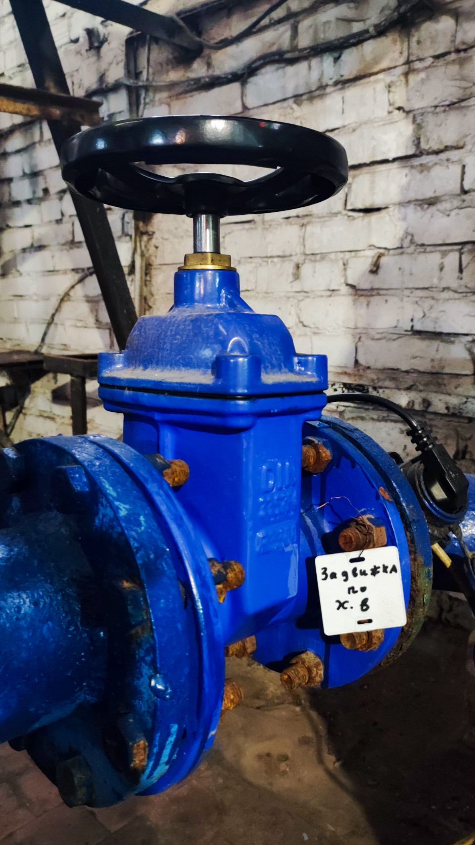 Синяя задвижка на трубопроводе с маркировочной биркой
