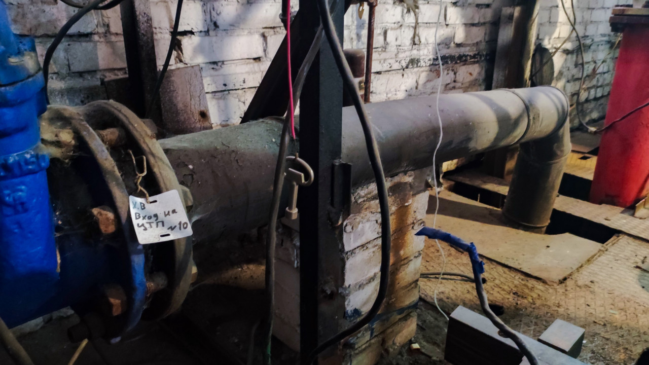 На фото показан участок металлического трубопровода серого цвета, закреплённого на опоре. На фланце висит бирка с надписью «Х.В. Вход на ЦТП №10», обозначающая принадлежность линии к системе холодного водоснабжения. Рядом проходят кабели и металлические элементы конструкции помещения. Снимок демонстрирует типичное расположение инженерных коммуникаций в подвале или насосной станции. Может использоваться в обучающих материалах по инженерным сетям, эксплуатации или техосмотрам.