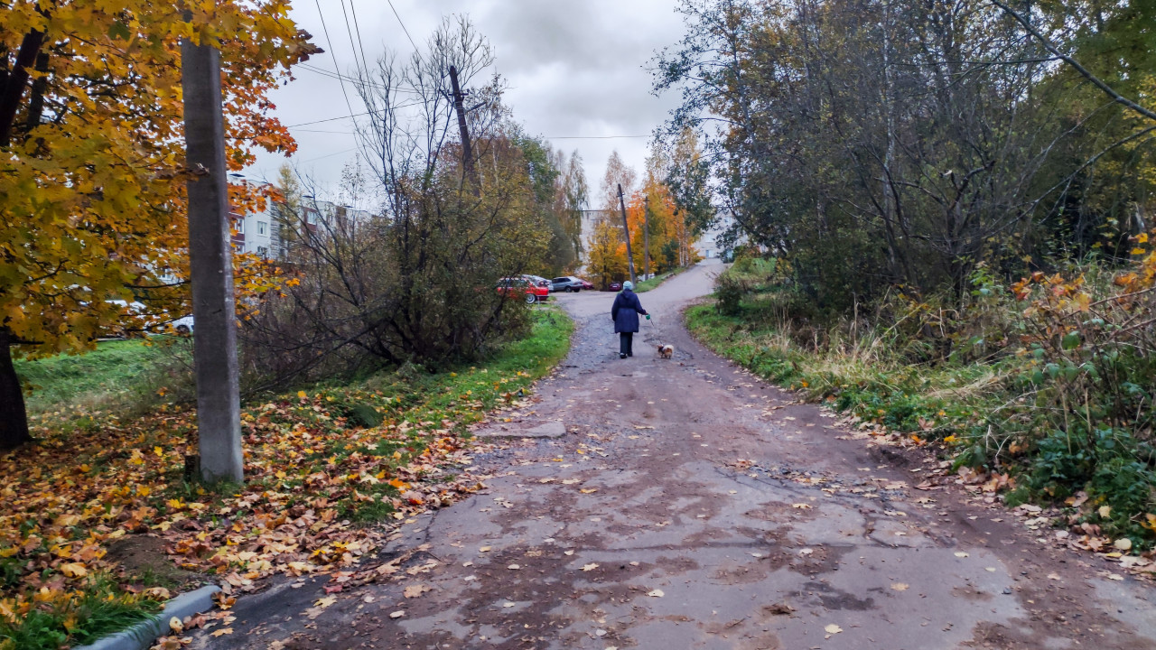 На фотографии осенний пейзаж в жилом районе небольшого города. Асфальтированная дорога с трещинами и неровностями уходит вглубь кадра, по ней идёт человек в тёмной куртке, держащий на поводке небольшую собаку. По обе стороны дороги растут деревья с пожелтевшими листьями, часть листвы уже опала на землю. На заднем плане видны многоэтажные дома, автомобили и серое небо, характерное для поздней осени. Фото отражает типичный вид российских дворов в сезон листопада и может использоваться в статьях о городской среде, сезонных изменениях, пешеходной инфраструктуре и бытовых сценах.