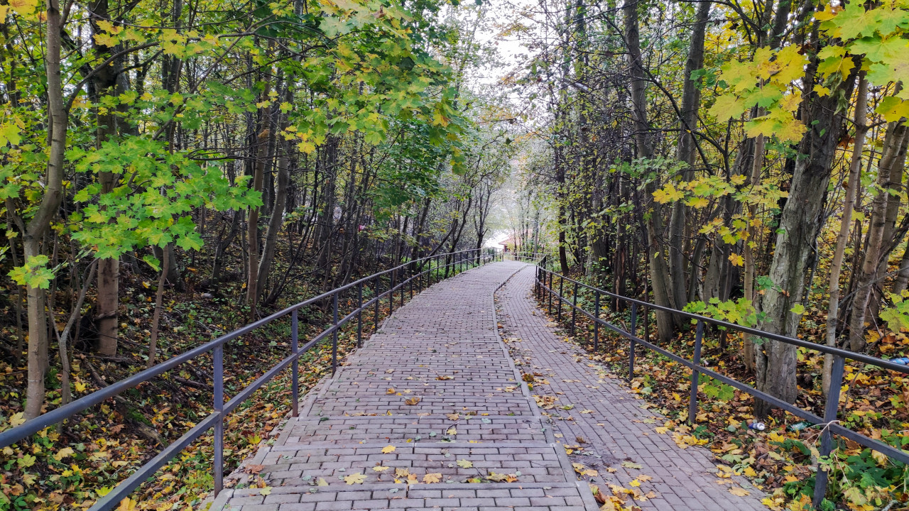 На фотографии запечатлена пешеходная дорожка, выложенная тротуарной плиткой и идущая между рядами деревьев с осенней листвой. По обе стороны установлены металлические перила, создающие безопасный спуск или подъём по склону. Листья жёлтого и зелёного оттенков частично лежат на дорожке, а остальные ещё держатся на ветках, что указывает на середину осени. Вдалеке виден просвет и продолжение тропы. Такое изображение подходит для иллюстраций о благоустройстве парков, городской среде, сезонных изменениях природы и инфраструктуре для прогулок.