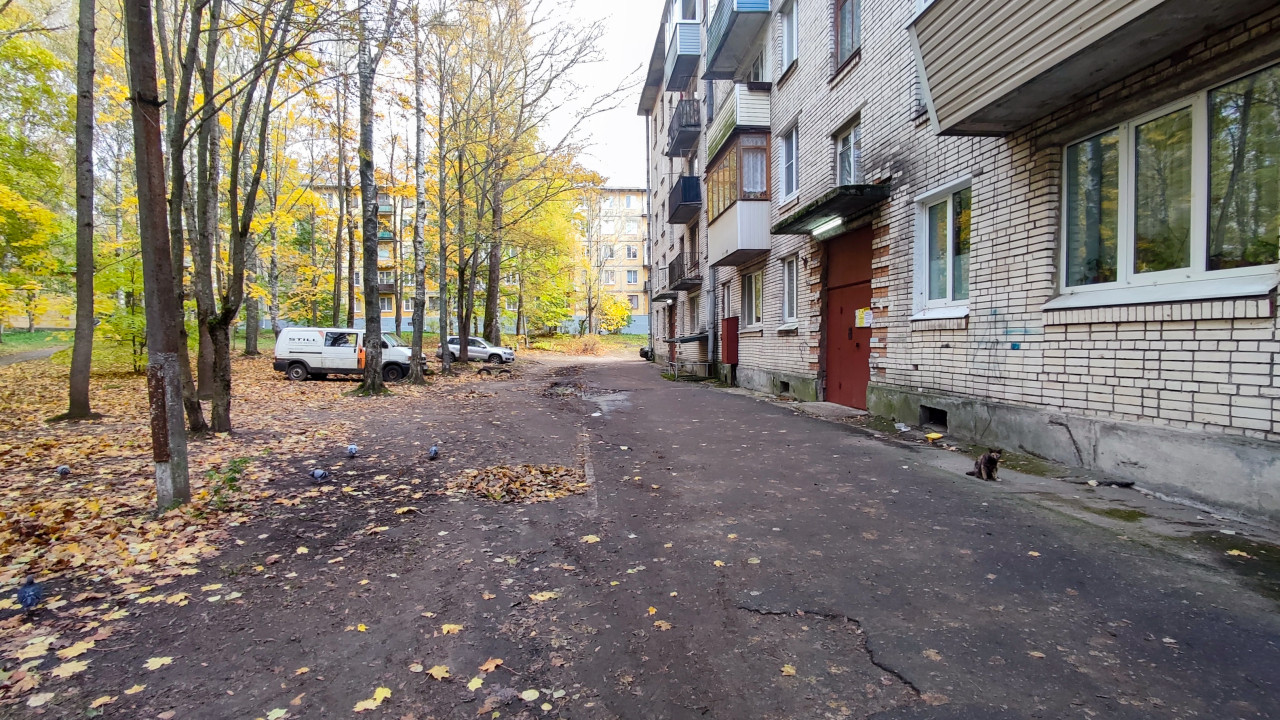 Снимок показывает вид вдоль фасада пятиэтажного кирпичного дома с серыми и белыми оконными рамами и застеклёнными балконами. На переднем плане — вход в подъезд с металлической дверью и навесом с лампой. По обе стороны дороги расположены деревья с осенней листвой, местами лежат опавшие листья. Вдоль здания припаркованы автомобили, среди которых виден белый фургон. Покрытие асфальта неровное, местами с лужами и следами разрушений. Двор типичен для микрорайонов 1970-х годов и иллюстрирует городскую повседневность. Фото можно использовать в статьях о жилищном фонде, благоустройстве, городской инфраструктуре и транспортной доступности жилых кварталов.