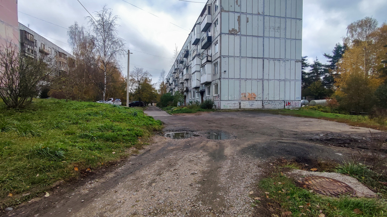 придомовая территория двор дворовая территория двор жилого дома жилой двор жилой квартал спальный район городской двор городская среда благоустройство территория около дома панельный дом фасад балконы дорога асфальт гравий лужи люк зелёная зона трава деревья кустарники осень листья Россия микрорайон архитектура СССР урбанистика советская архитектура жильё типовая застройка старый жилой фонд городской пейзаж инфраструктура жилой район панельная застройка дом 1970 х транспортПохожие фотографии