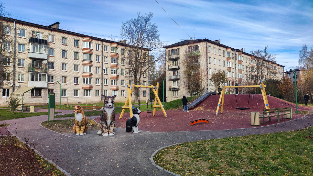 На фотографии показана территория благоустроенного двора с детской игровой зоной, расположенной между несколькими типовыми пятиэтажными жилыми домами из силикатного кирпича. В центре кадра размещена игровая площадка с прорезиненным покрытием, установленными качелями, малой архитектурной формой в виде искусственных скульптурных фигур кошек и приподнятой зоной для катания или лазания. По периметру оборудованы пешеходные дорожки, урны и скамейки. Дома на фоне относятся к массовой жилой застройке середины второй половины XX века, характерной для крупных городов Северо-Запада России. На фото также видны газон, молодые деревья и кустарники. Изображение может быть использовано в материалах о благоустройстве придомовых территорий, муниципальных программах модернизации дворов, примерах малых архитектурных форм и организации общественных пространств.