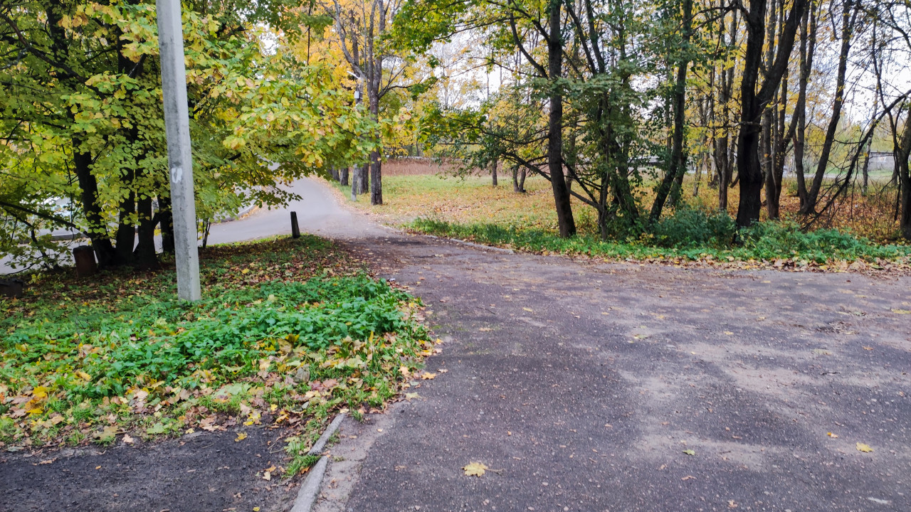 На фото изображён участок асфальтированной дороги, ведущей от жилых домов к зелёной парковой зоне. Вдоль дороги растут деревья с густой листвой, частично пожелтевшей от осеннего сезона. На переднем плане виден обочинный газон с травой и опавшими листьями, а также бетонный бордюр. Асфальтовое покрытие имеет неровности и следы износа. Сцена типична для переходной зоны между жилыми дворами и природной территорией в российских городах. Снимок можно использовать для иллюстраций по темам благоустройства, городской инфраструктуры и природных ландшафтов.