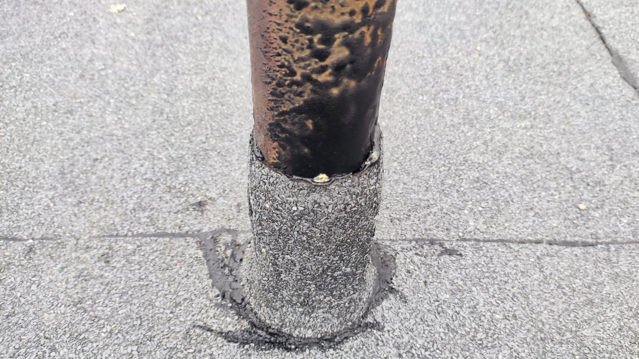 Изображение фиксирует узел примыкания металлической стойки к плоскости кровли, обработанный мастикой и гидроизоляционным материалом. Стойка имеет следы коррозии и термического воздействия, что указывает на эксплуатационный износ. Гидроизоляционное покрытие уложено внахлёст, вокруг узла видны следы герметизации. Снимок относится к техническим и может использоваться для наглядной демонстрации конструктивных решений и участков повышенного риска протечки на плоских кровлях.