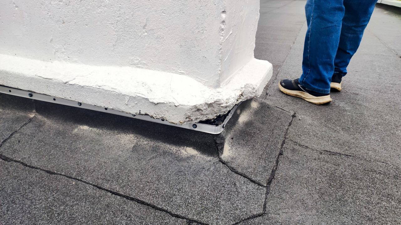 На фотографии показан узел примыкания рулонной кровли к стене вентшахты на эксплуатируемой плоской кровле многоквартирного здания. В кадре виден нижний участок стенового примыкания с металлическим прижимным профилем, зафиксированным на дюбель-саморезах, а также слой битумного рулонного материала, заведённого на вертикальную поверхность. На настиле заметны трещины в верхнем слое кровельного ковра, следы подсыпки и участки местного ремонта. Конструкция расположена на верхнем уровне крыши жилого дома типовой городской застройки. Такой узел является типовым решением для герметизации сопряжений при выводе инженерных шахт через кровлю и используется для защиты от проникновения влаги.