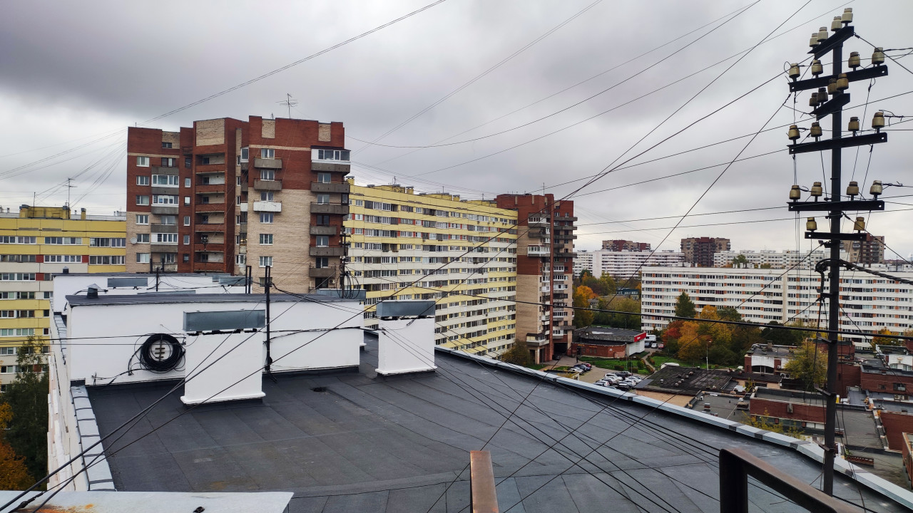 На фотографии представлен вид с верхнего уровня плоской крыши многоквартирного дома, откуда открывается панорама жилого района с характерной застройкой позднесоветского периода. В кадре видны инженерные элементы кровли, вентшахты, антенные крепления, а также многочисленные натянутые тросовые линии, используемые для связи и электроснабжения. На заднем плане располагаются несколько панельных жилых домов большой этажности, построенных по типовым серийным проектам, распространённым в городах России в конце XX века. Такие здания возводились массово в рамках программ комплексного жилищного строительства, обеспечивая высокую плотность заселения микрорайонов. Фотография может быть использована в материалах о городской инфраструктуре, эксплуатации многоквартирных домов, а также иллюстрировать тему инженерного оснащения кровель.