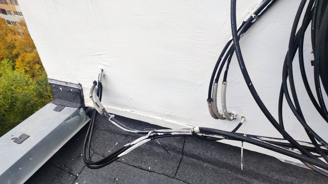 На изображении показан участок плоской кровли с выводом нескольких кабельных линий, проходящих через стену вентшахты в защитных гофрированных трубах. Видна точка ввода кабелей в ограждающую конструкцию, следы герметизации, а также фрагмент металлического парапетного ограждения. Кабели уложены по поверхности кровельного ковра, что является распространённым вариантом прокладки при подключении антенн, коммуникационного оборудования и систем связи. Узел относится к категории инженерных проходок через ограждающие конструкции. Фотография может использоваться для наглядной иллюстрации способов прокладки слаботочных и телекоммуникационных линий на крышах многоквартирных домов.
