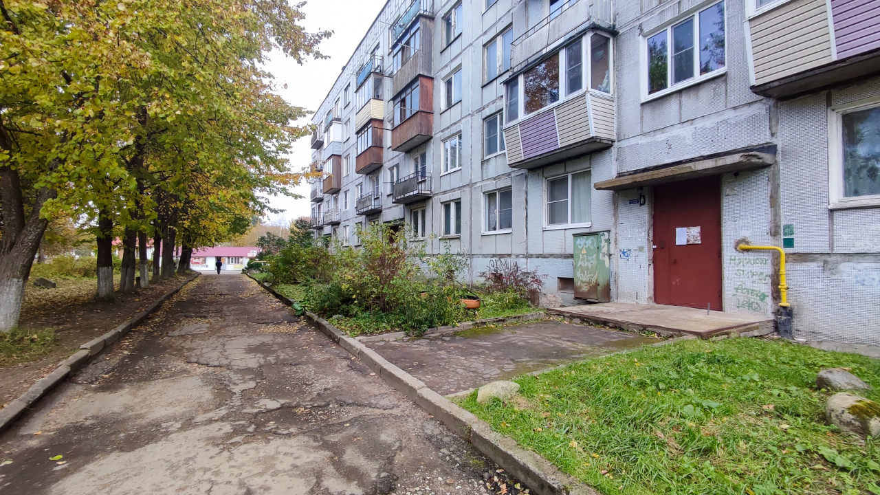 Снимок показывает типовой пятиэтажный жилой дом советского периода, фасад которого выполнен из серых бетонных панелей. Перед зданием идёт дворовая дорога с дефектами асфальта, по левой стороне высажен ряд деревьев с зелёно-жёлтой листвой. У подъездов видны лавочки и клумбы с растениями. Архитектура и планировка двора характерны для массовой застройки 1970-х годов. Фотографию можно использовать в материалах о городской среде, благоустройстве и советском градостроительстве.