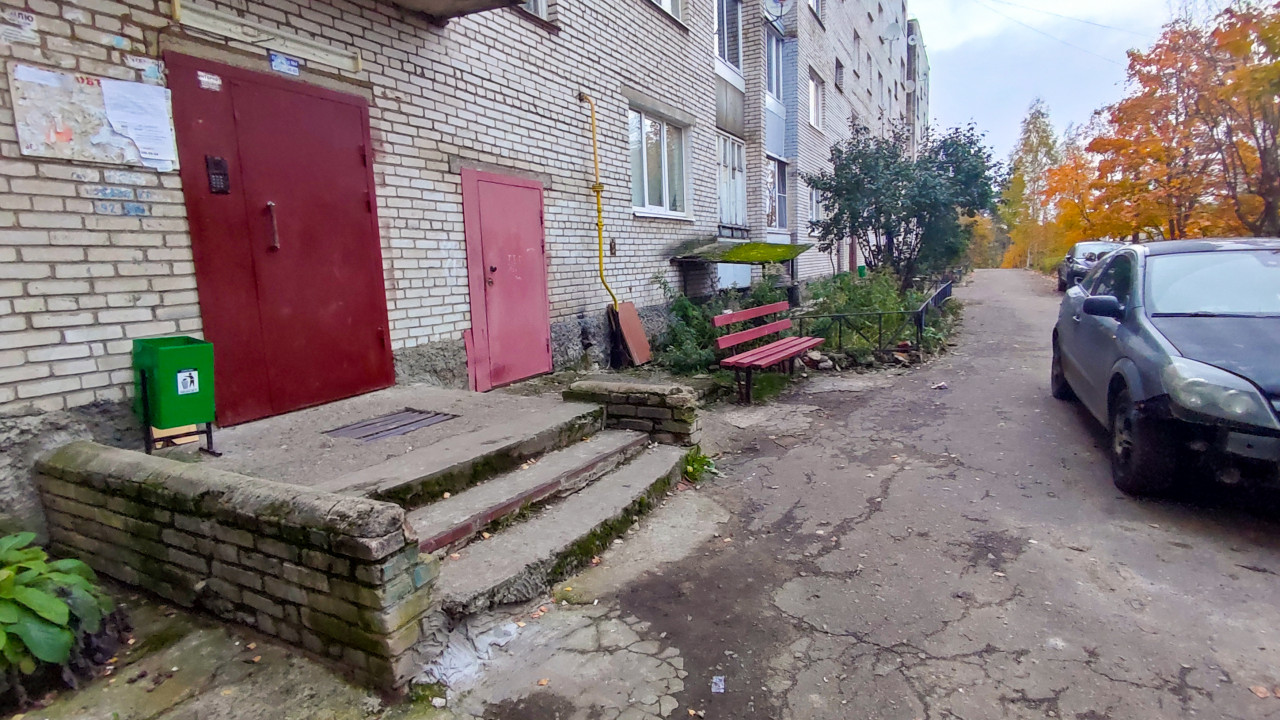 На фотографии изображён фасад типового пятиэтажного кирпичного дома советской постройки. Перед подъездом расположена лестница с бетонными ступенями и зелёной урной, рядом стоит красная металлическая дверь. У стены установлена деревянная лавочка, возле которой растут кустарники. По асфальтированной дороге перед домом припаркован автомобиль. На заднем плане виднеются деревья с осенней листвой. Фото можно использовать в темах о городской архитектуре, благоустройстве и повседневной жизни жилых районов.