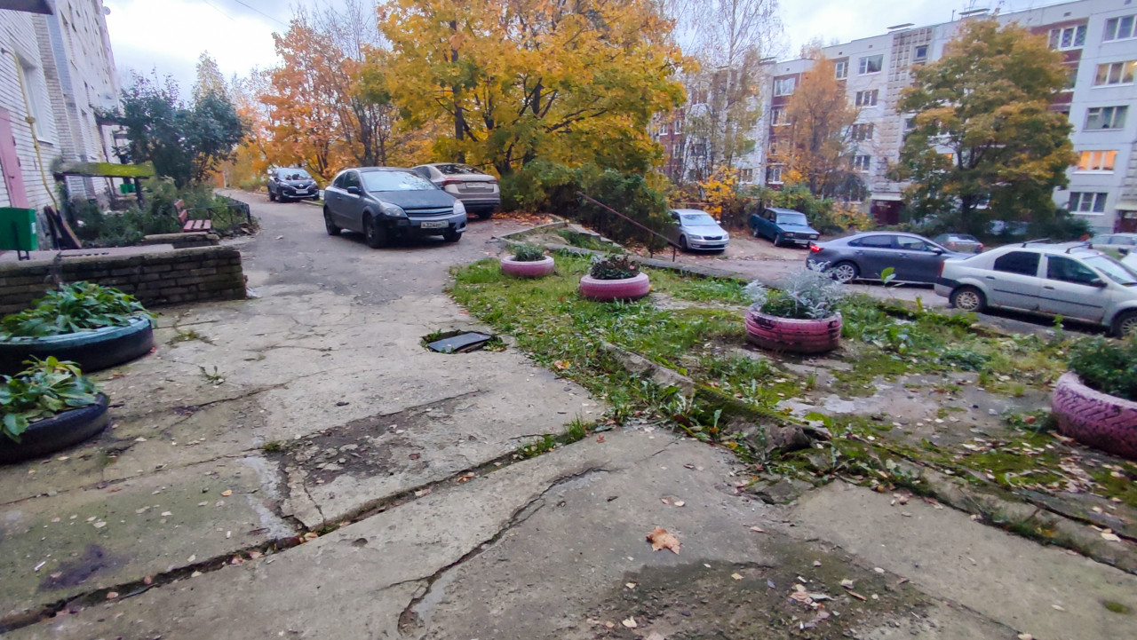 Осенний двор с клумбами из шин и припаркованными автомобилями