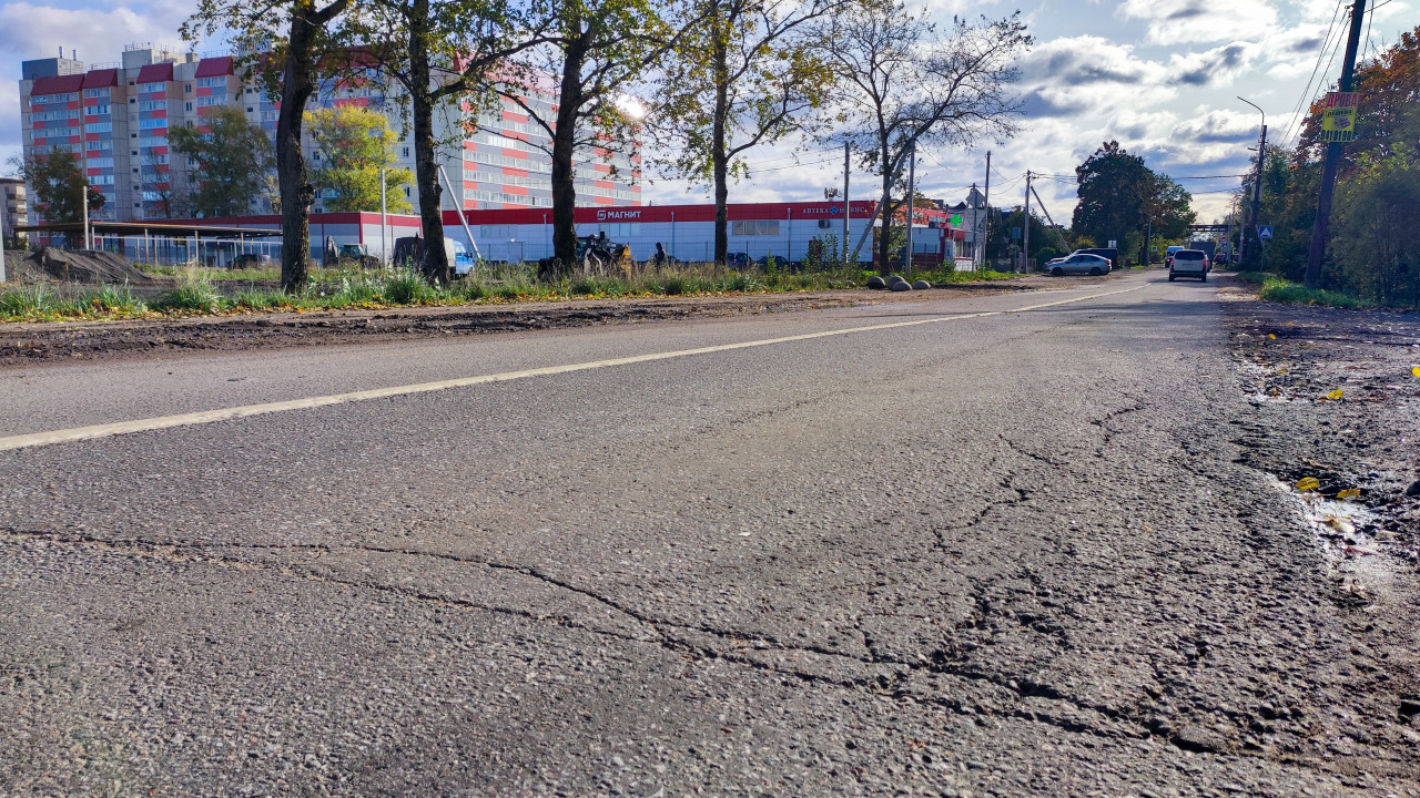 На фото изображён участок асфальтированной дороги, снятый с низкой точки. На поверхности видны трещины и следы износа покрытия. На заднем плане расположены жилые дома и здание с вывеской торговой сети «Магнит». По обочине — деревья и автомобили. Солнечное освещение подчёркивает фактуру асфальта и мелкие дефекты. Сцена отражает типичное состояние дорожного полотна в городах средней полосы России и может использоваться для иллюстрации тем, связанных с обследованием дорог, ремонтом и эксплуатацией дорожной сети.