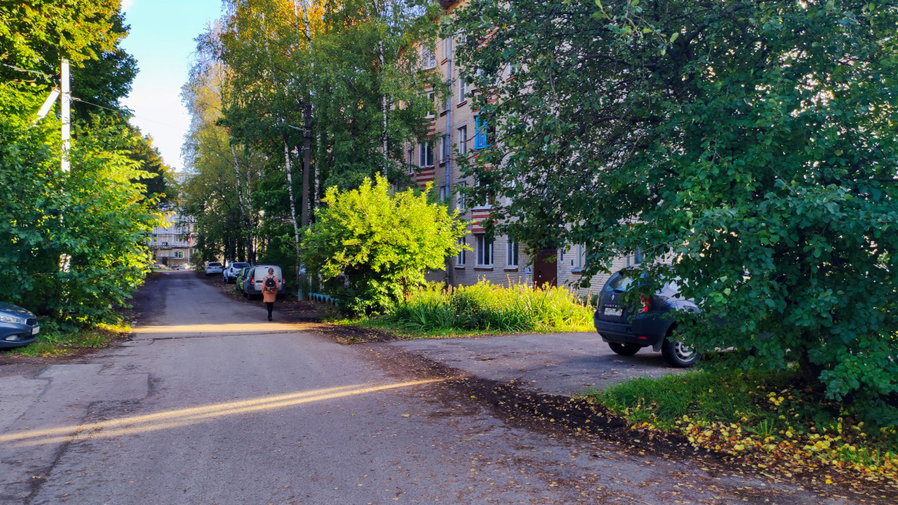 На фотографии изображён небольшой жилой квартал с пятиэтажными кирпичными домами, окружёнными зелёными деревьями. По обе стороны дороги припаркованы автомобили, а в центре кадра виден пешеход. Свет солнца пробивается сквозь листву, создавая мягкое естественное освещение. Сцена характерна для городских окраин Ленинградской области. Снимок подходит для использования в статьях и визуальных материалах, посвящённых теме урбанистики, типовой застройки и благоустройства российских городов.