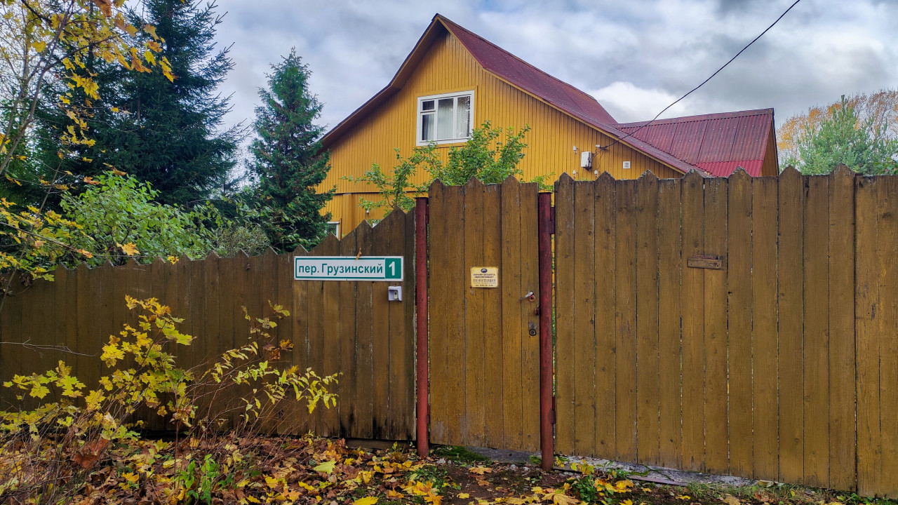 На снимке показан фрагмент жилого участка с высоким деревянным забором и калиткой. На воротах прикреплена табличка с адресом «пер. Грузинский, 1». За забором виден деревянный дом с жёлтой обшивкой и крышей бордового цвета. Вокруг растут ели, кустарники и лиственные деревья с осенней листвой. Погода пасмурная, небо затянуто облаками. Сцена иллюстрирует атмосферу загородного посёлка в осенний сезон и подходит для материалов о частной застройке, адресных указателях и архитектуре малых населённых пунктов.