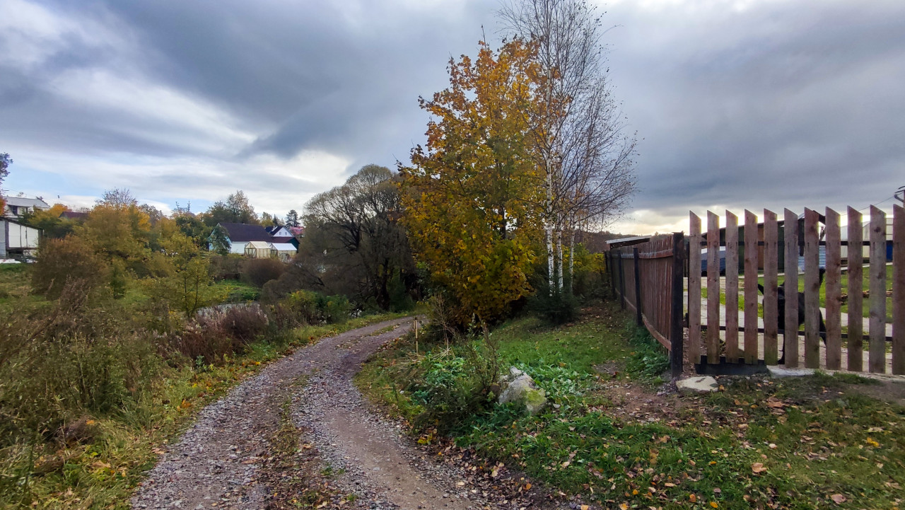 На фотографии изображена узкая грунтовая дорога, проходящая между частными домами и деревянным забором. Дорожное покрытие состоит из утрамбованного щебня и земли, по обочинам растёт высокая трава и кустарники, местами уже пожелтевшие от осеннего холода. Справа виден деревянный штакетник, за которым располагается частный участок. На заднем плане заметны жилые дома с двускатными крышами, окружённые деревьями с листвой разных оттенков — от зелёного до жёлтого. Небо затянуто плотными облаками, создающими типичную погоду для северной части России в октябре. Такое изображение подходит для использования в материалах о сельской жизни, загородной застройке, дорожной инфраструктуре или природных пейзажах.