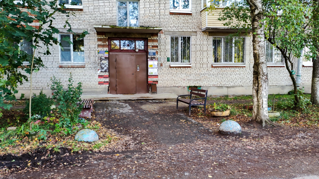 придомовая территория двор дворовая территория двор жилого дома жилой двор жилой квартал спальный район городской двор городская среда благоустройство территория около дома дом подъезд жилой дом советская архитектура кирпичное здание фасад дверь лавочка зелень растения клумба тротуар асфальт ограничитель бетонные полусферы листва осень урбанистика многоквартирный дом советская застройка Россия Ленинградская область ЖКХ инфраструктура старый дворПохожие фотографии