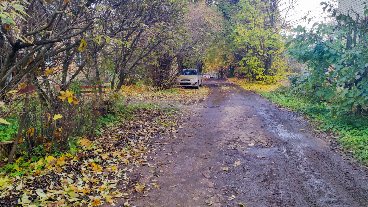 На фотографии изображён участок дворовой грунтовой дороги, проходящей вдоль жилых домов. Покрытие неровное, с остатками луж и следами от автомобильных шин. Вдоль дороги располагаются густые кустарники и деревья, образующие зелёный коридор. В глубине кадра виден припаркованный автомобиль, частично скрытый растительностью. Осенняя листва покрывает значительную часть поверхности, что подчёркивает сезон. Снимок может использоваться в материалах о дворовой инфраструктуре, состоянии внутриквартальных дорог и благоустройстве жилых территорий.