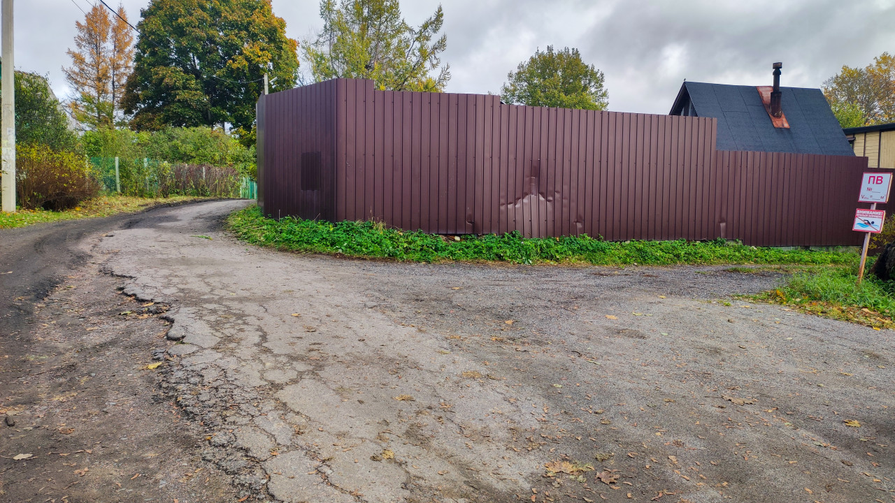Фотография показывает участок асфальтированной дороги в частном секторе. Дорога с трещинами и следами ремонта поворачивает за угол коричневого забора из профнастила, за которым виден дом с тёмной крышей и трубой. Вдоль обочины растут деревья с частично опавшей листвой и кустарники. На правой стороне установлены предупреждающие таблички, связанные с противопожарной безопасностью. Пасмурное небо и влажный асфальт указывают на недавние осадки. Изображение можно использовать в материалах о дорожном покрытии, благоустройстве, пожарной безопасности и загородной инфраструктуре.