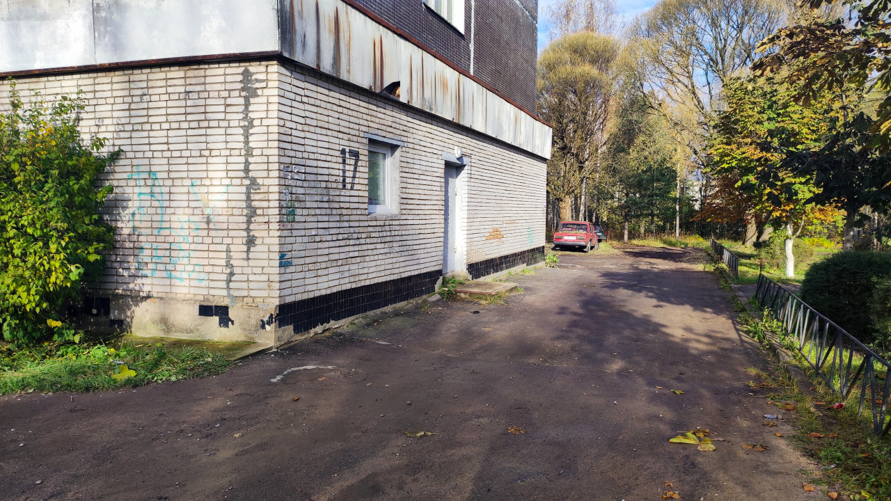 На фотографии показан фрагмент первого этажа панельного многоквартирного дома с непрозрачным цоколем и входной дверью, ведущей в подсобное помещение или нежилую часть здания. Стены выполнены из светлого силикатного кирпича с отдельными следами ремонта, что выражается в участках свежей кладки и заделки швов. На поверхности стен присутствуют граффити и следы выцветшей краски. Справа виден внутридворовый проезд, уходящий вглубь двора, вдоль которого расположены металлические ограждения озеленённых участков и кустарники. В глубине кадра стоит автомобиль ранних лет выпуска, оставленный рядом с деревьями, что усиливает визуальный контекст старой жилой застройки. Осенний период подтверждается опавшей листвой и оголёнными ветвями. Снимок может быть использован для тем благоустройства, старого фонда жилья, эксплуатации придомовых территорий, визуальной документации городской среды.
