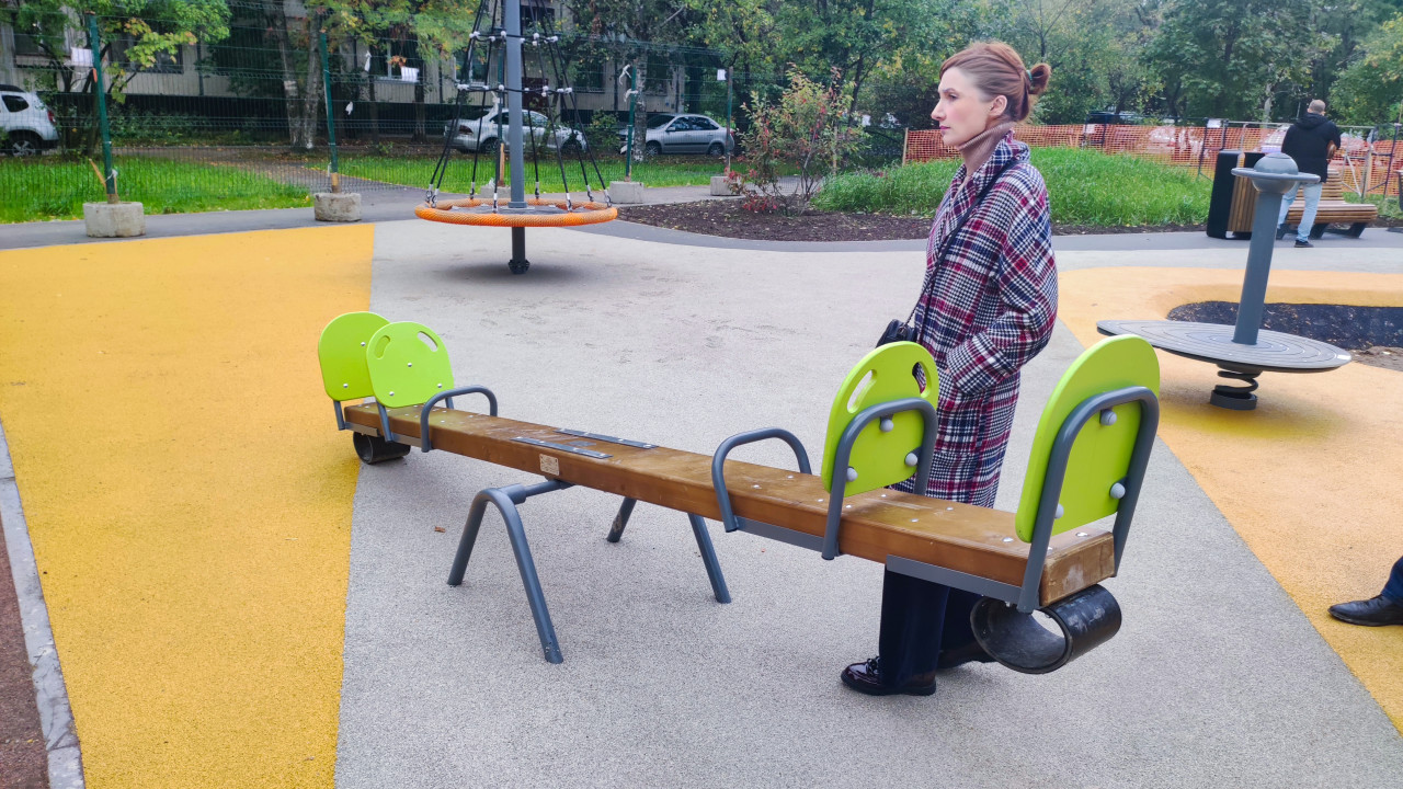 На фото изображён участок новой детской площадки, где женщина осматривает качалку-балансир с зелёными сиденьями. На заднем плане видны другие игровые элементы, включая вращающуюся конструкцию и пружинный элемент. Покрытие площадки выполнено в двух цветах — сером и жёлтом, что подчёркивает зонирование. Снимок отражает процесс осмотра и приёмки благоустроенной территории после монтажа игрового оборудования.