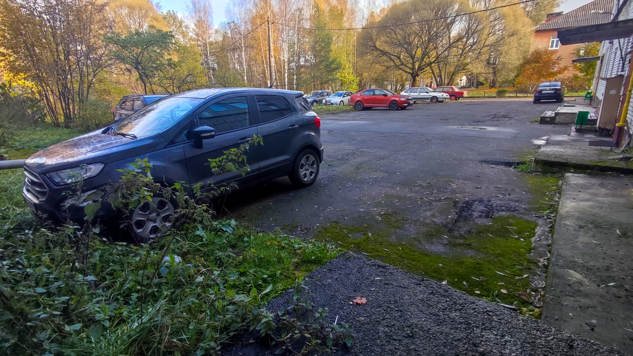 На снимке изображена придомовая территория между жилым домом и зелёной зоной. В кадре видны припаркованные автомобили, часть которых находится рядом с крыльцом здания. Слева просматриваются кустарники и густая растительность. Покрытие дворовой площадки асфальтовое, с участками мха и следами влаги. За парковкой располагаются деревья и другие дома аналогичной архитектуры. Фотография отражает реальную придомовую среду и может использоваться в тематиках благоустройства, эксплуатации придомовых территорий и городской инфраструктуры.