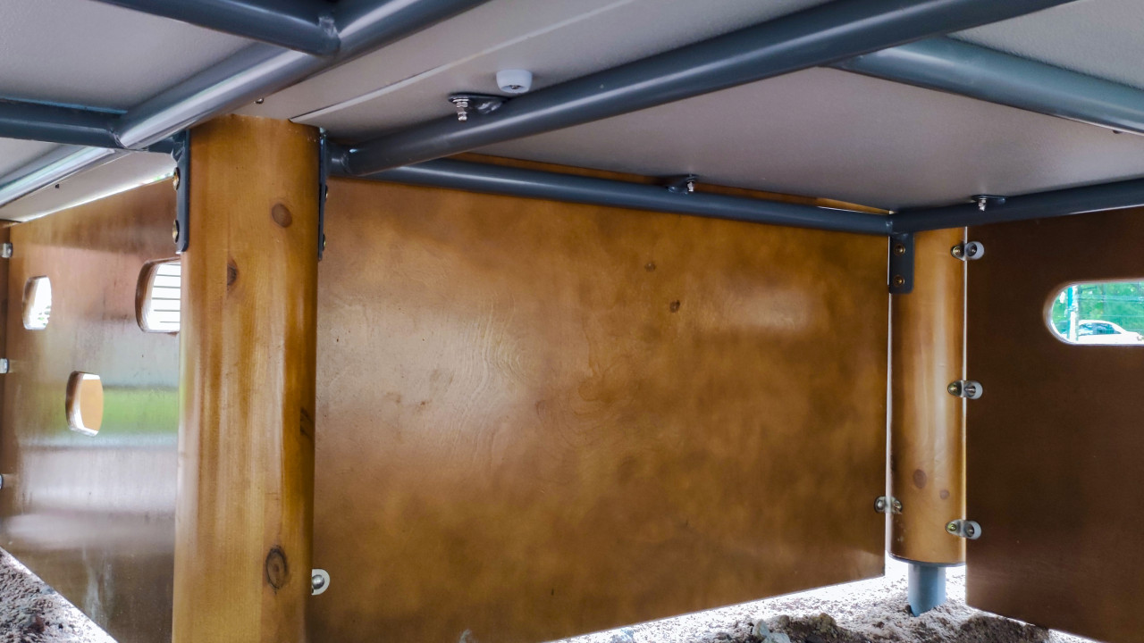 На снимке показан нижний уровень конструкции детского игрового домика. Видны металлические трубы каркаса, крепления к деревянным панелям и песчаное основание. Узлы соединения зафиксированы с помощью болтов, что обеспечивает жёсткость и устойчивость конструкции. Фото сделано в рамках строительной экспертизы для проверки качества сборки и надёжности креплений оборудования на площадке.